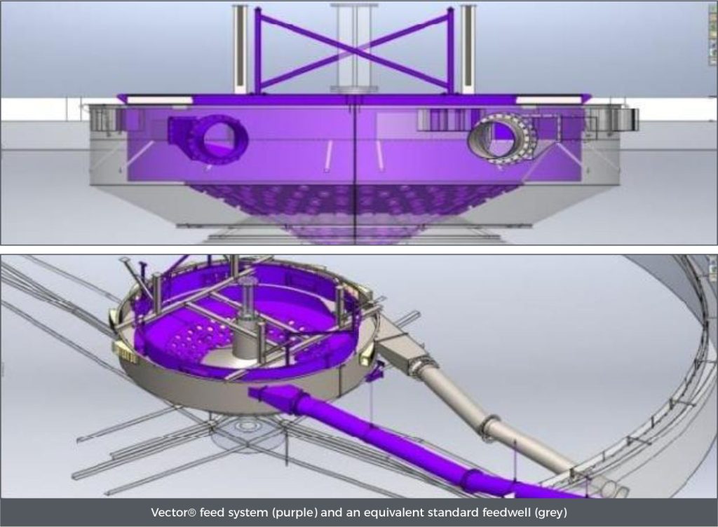 Physical Comparison: The P&C Vector® feed system offers less interference with existing structures and typically has a smaller diameter than its equivalent standard feedwell counterpart. Because of its smaller diameter and wear resistant urethane components, it is also much lighter. Figure 7 presents a visual comparison of the Vector® feed system and an equivalent standard feedwell with a similar duty.